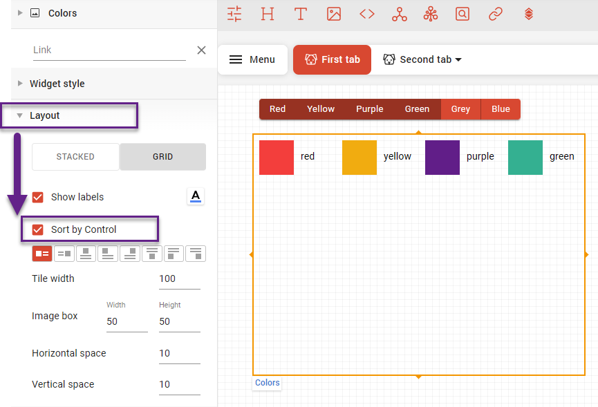 To activate the feature in EDIT mode go to the left menu panel → Layout → сheck the ‘Sort by control’ box.