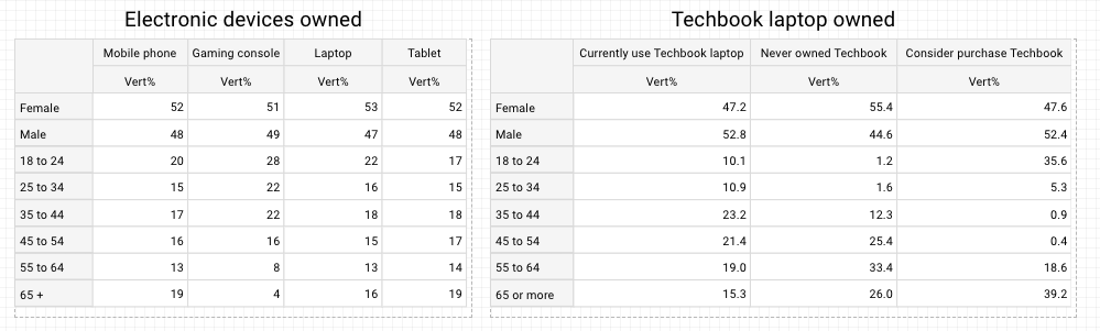 For example, we have two surveys conducted by different research agencies, and they both focus on tech device ownership. The first survey focuses on the general level of device ownership and the second survey focuses on the specifics of laptop brands, in particular the Techbook brand.
