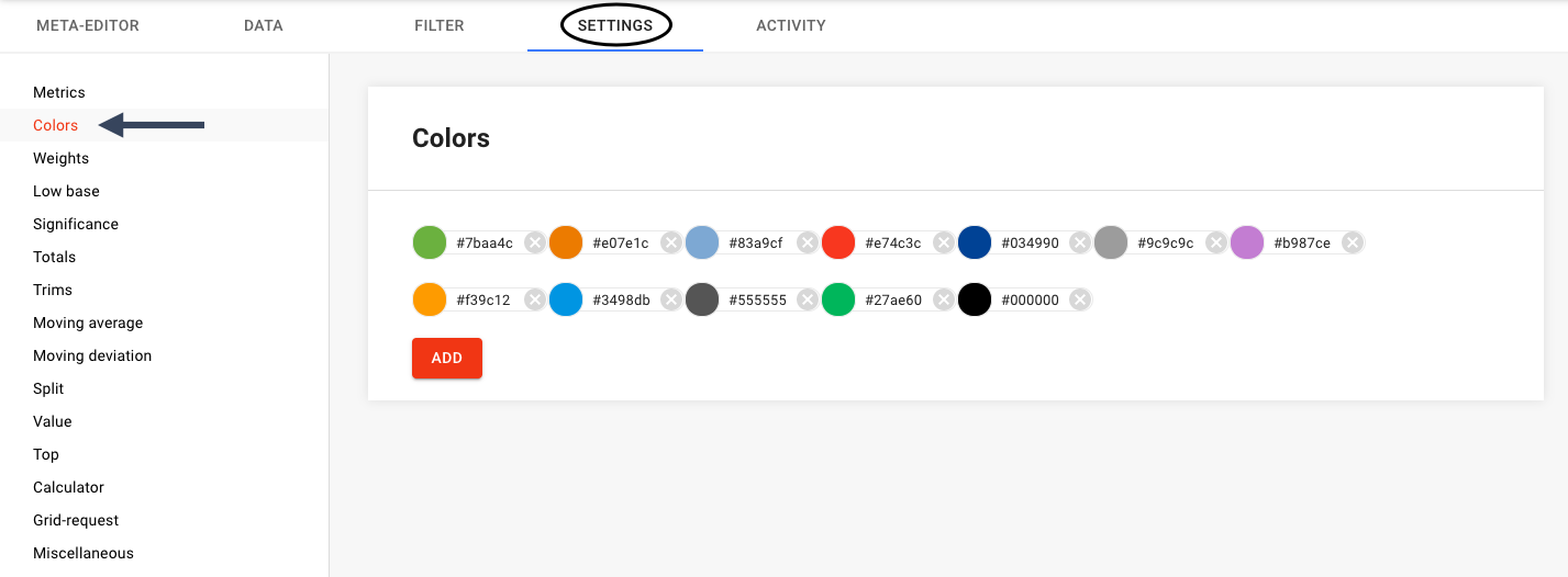 Here, you can add colors or alter the hex codes of colors.