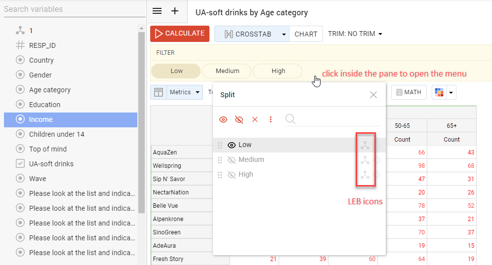 The creation of new options is also available after some variables are added to the Splits. You can make them on the fly by dragging new options to the panel and using logical operations from the pop-up menu. Also, you can open the split's menu, click on the logical expression builder icon, and create logical variables.