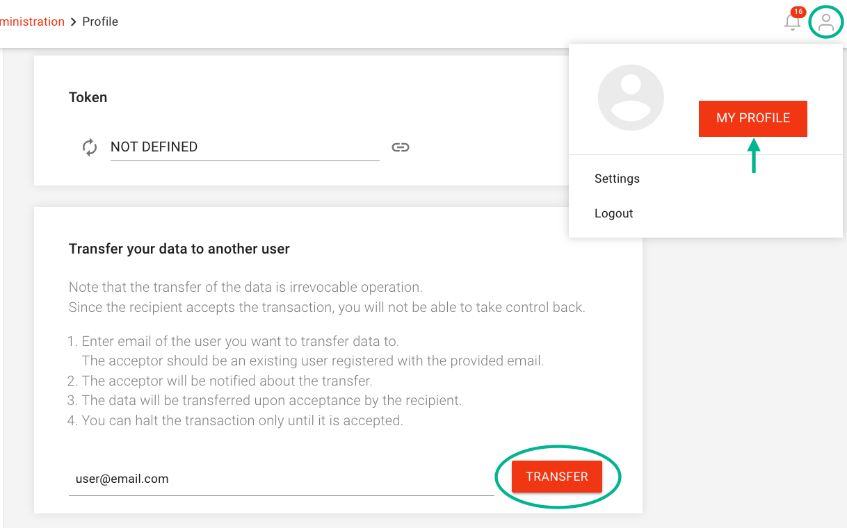 Enter the email address of an existing DataTile user to whom you want to transfer all your data;